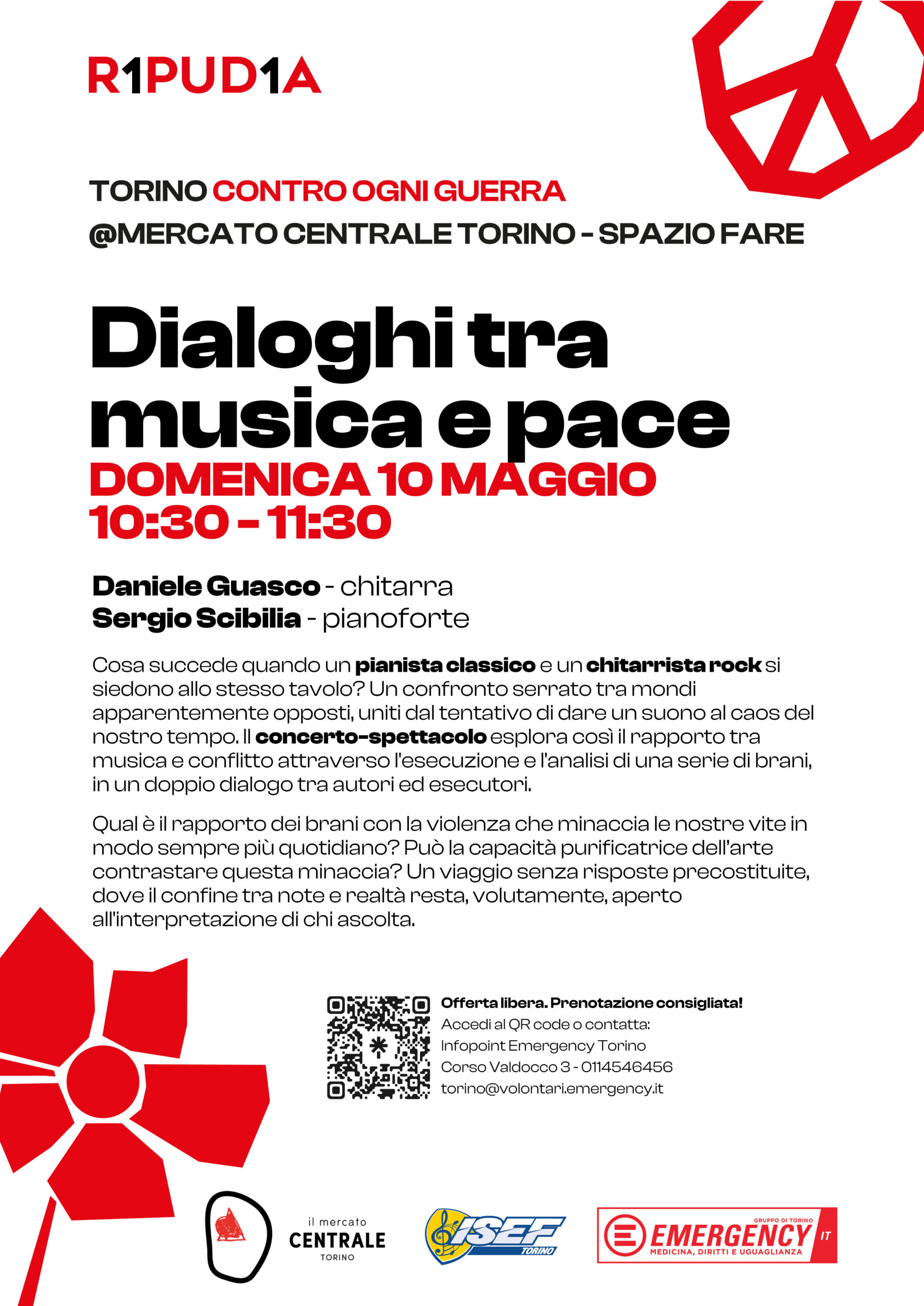 Domenica 10 maggio 2026, dalle ore 10:30 alle 11:30, presso lo Spazio FARE del Mercato Centrale Torino, andrà in scena “Dialoghi tra musica e pace”, un concerto-spettacolo che vedrà esibirsi Daniele Guasco alla chitarra e Sergio Scibilia al pianoforte, entrambi musicisti della nostra scuola.